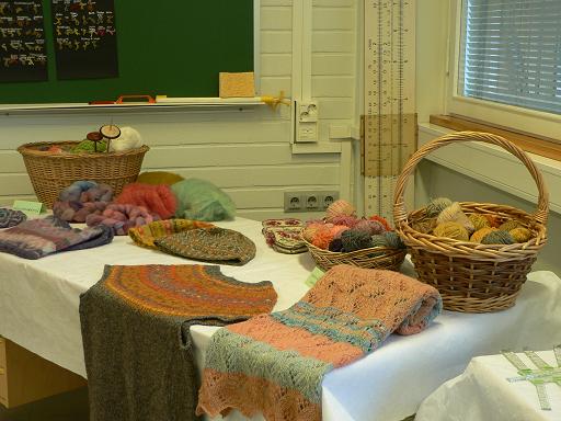 Minä olin tuonut näytille kasvivärjättyjä lankoja, niistä tehtyjä neuleita sekä kehrättyä lankaa ja värjättyä villaa. Mukana oli myös muutama värttinä ja rukki, joilla kehräsin näyttelyssä.